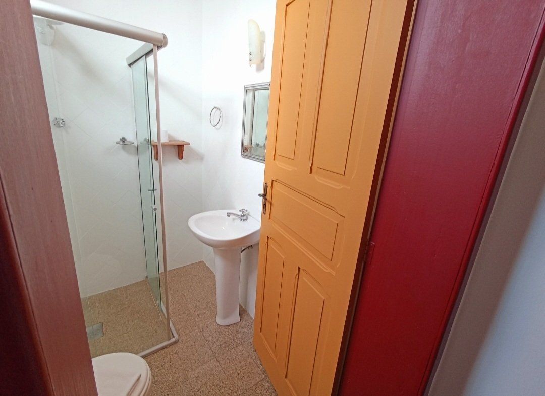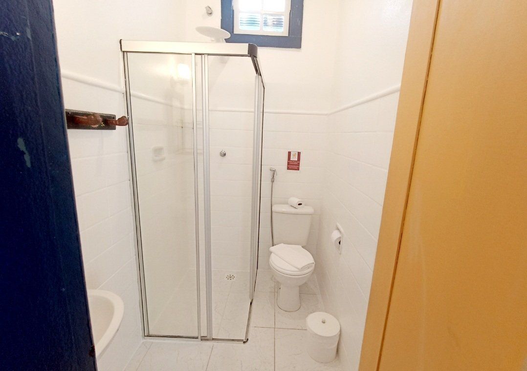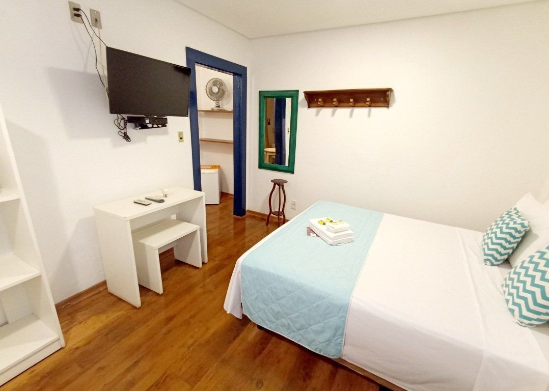 O apartamento Edelvais hospeda até três pessoas. Este quarto possui cama queen-size, banheiro privativo com Box Blindex, além da TV de tela plana de 32" com canais a cabo da SKY..