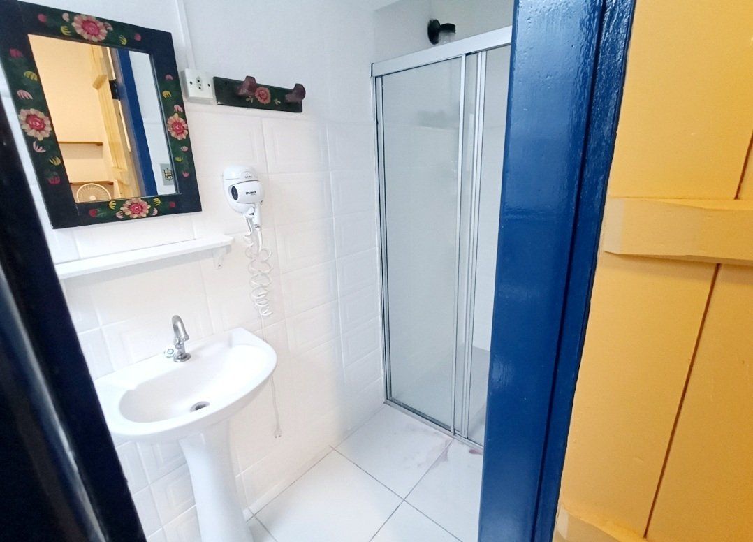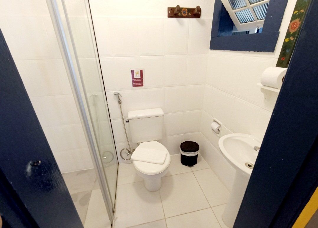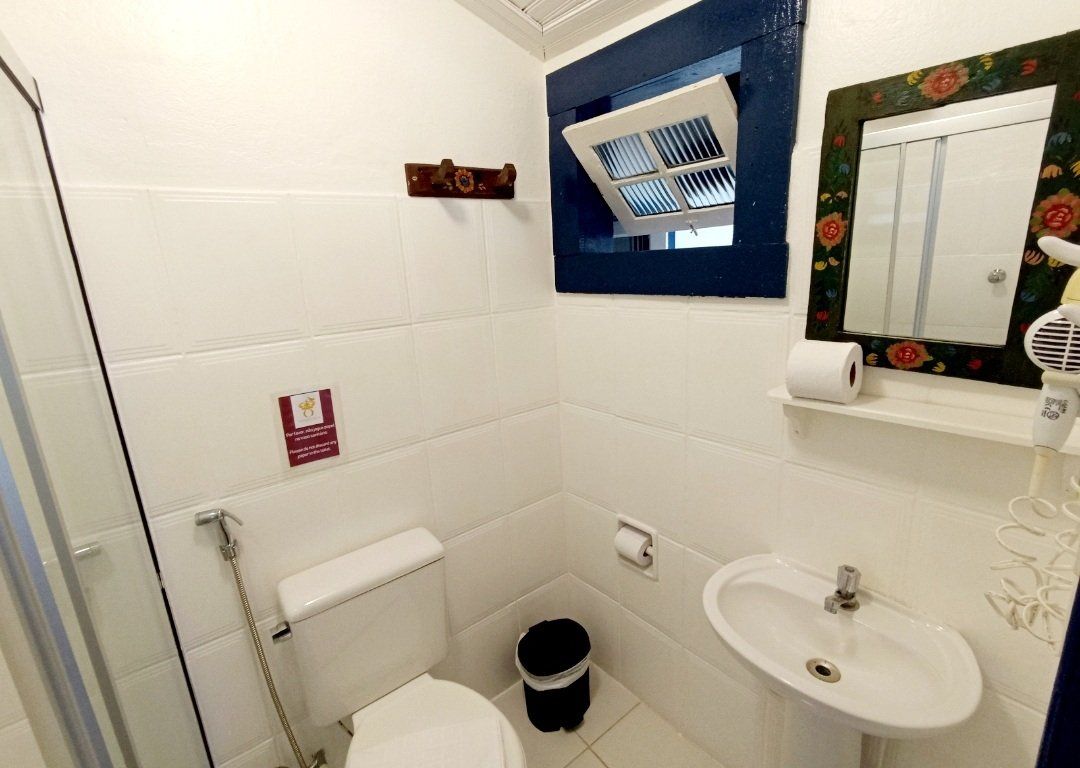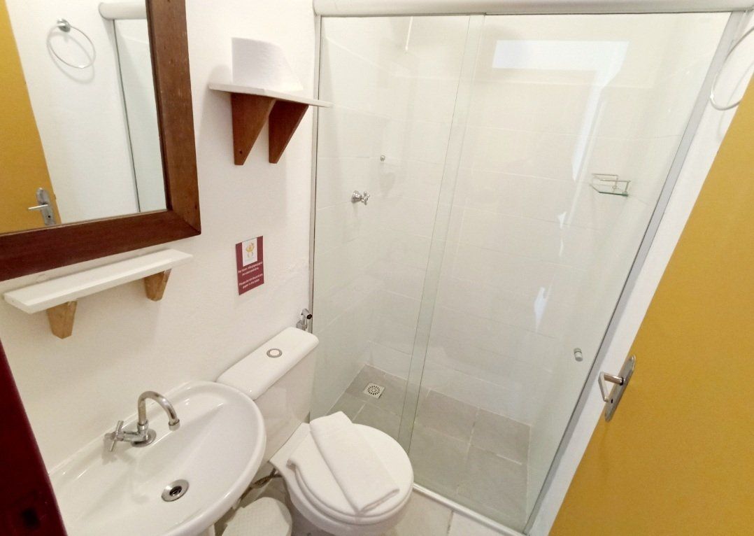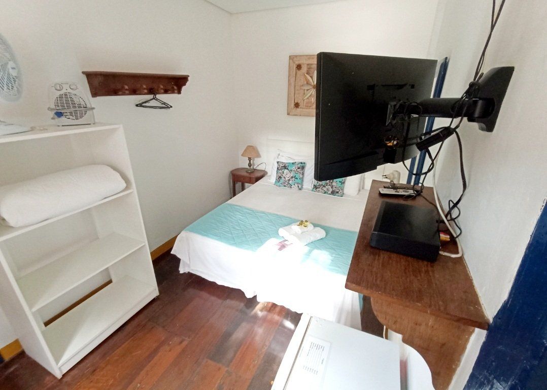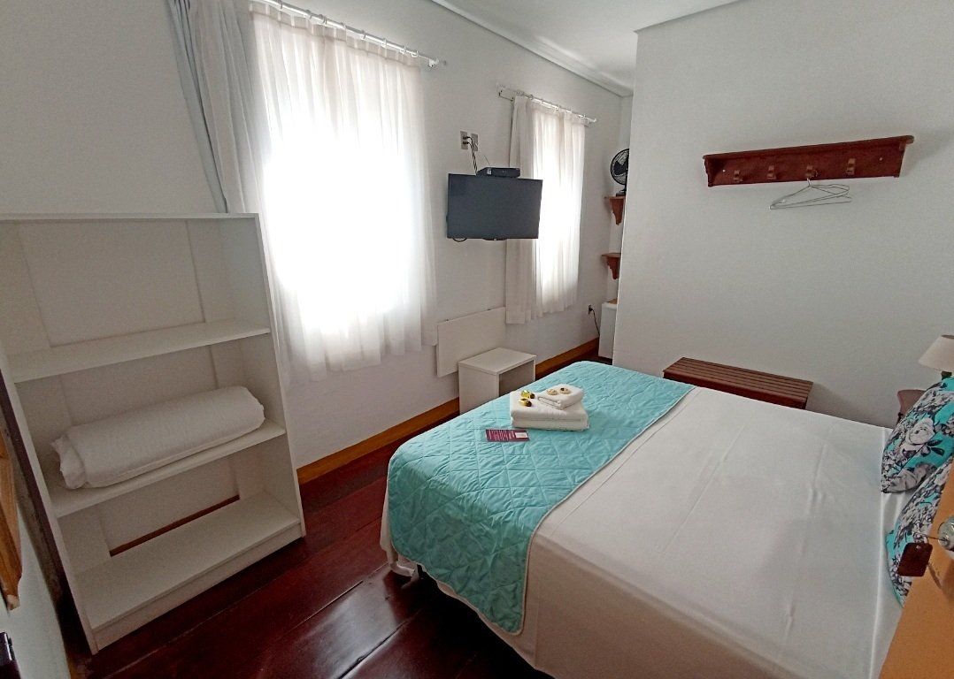 O apartamento Hibisco hospeda até duas pessoas. Este quarto possui cama queen-size, banheiro privativo com Box Blindex, além da TV de tela plana de 32" com canais a cabo da SKY.