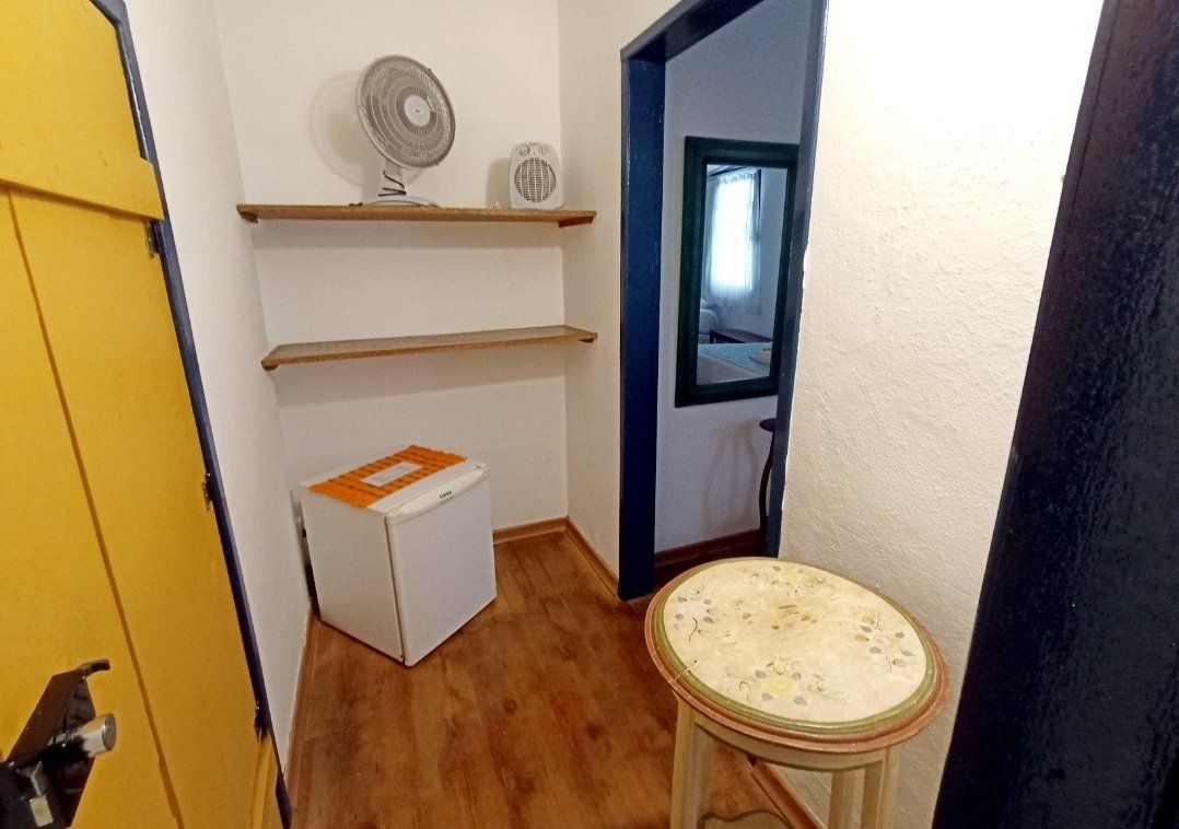 Este apartamento tem aproximadamente 25 metros quadrados, com ventilador, aquecedor elétrico, secador de cabelos e cortinas escurecidas. Ele tem também uma bancada com cadeira e frigobar.