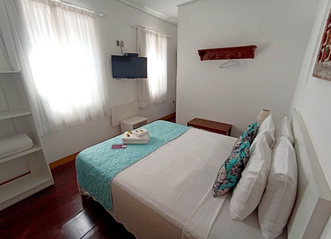 O apartamento Flor de Lis hospeda até duas pessoas em cama de casal. Este quarto possui cama padrão (1,88 x 1,36 m), banheiro privativo com Box Blindex, além da TV de tela plana de 32" com canais a cabo da SKY.